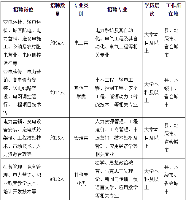 (三)专业:主要招聘电工类、其他工学类、管理类、其他专业类专业。应聘专业为主修专业(不含辅修专业和第二学位),且与教育部学籍在线验证报告完全一致。