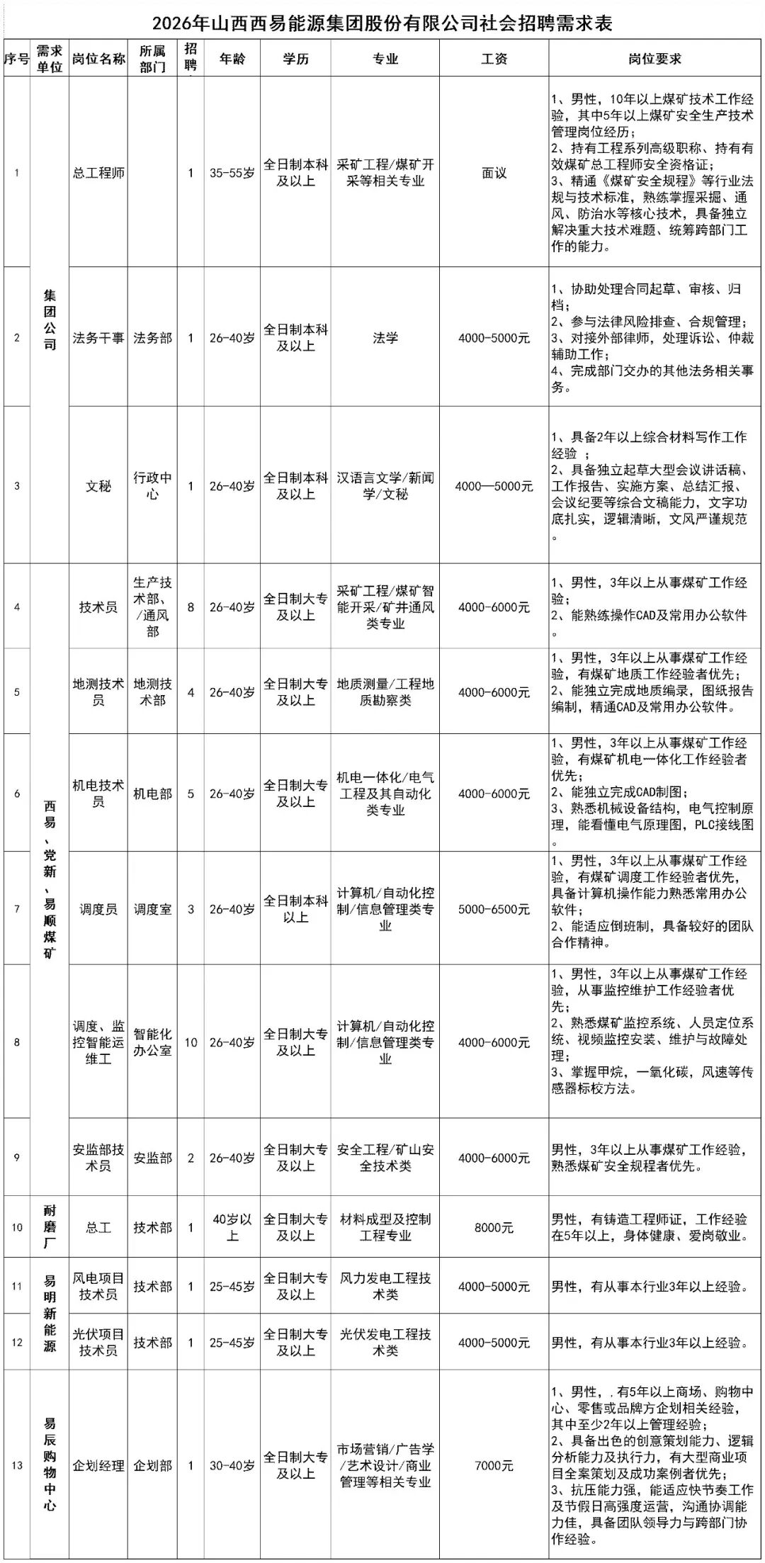 山西西易能源集团股份有限公司2026年社会招聘公告(山西省朔州市平鲁区)